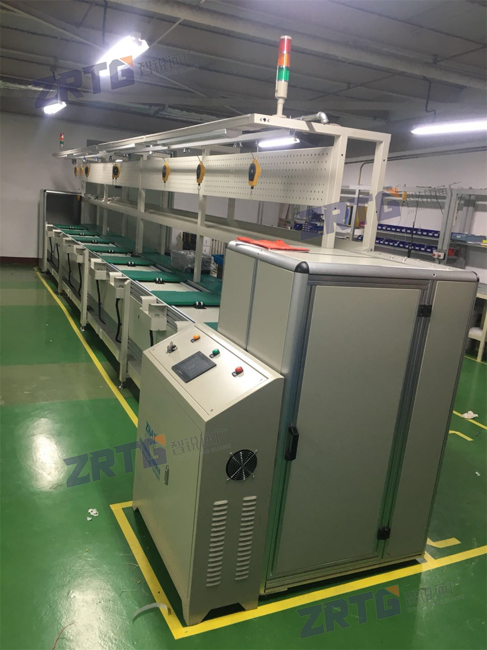倍速链流水线由动力系统、控制系统、输送链条、工装板、阻断器、灯架照明、风扇、铝型材框架组成,另行配备了工作台、电源插座、气路辅助设施。