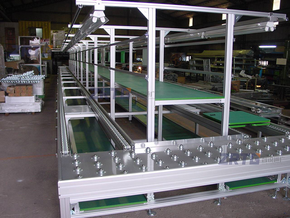 倍速链流水线由动力系统、控制系统、输送链条、工装板、阻断器、灯架照明、风扇、铝型材框架组成,另行配备了工作台、电源插座、气路辅助设施。