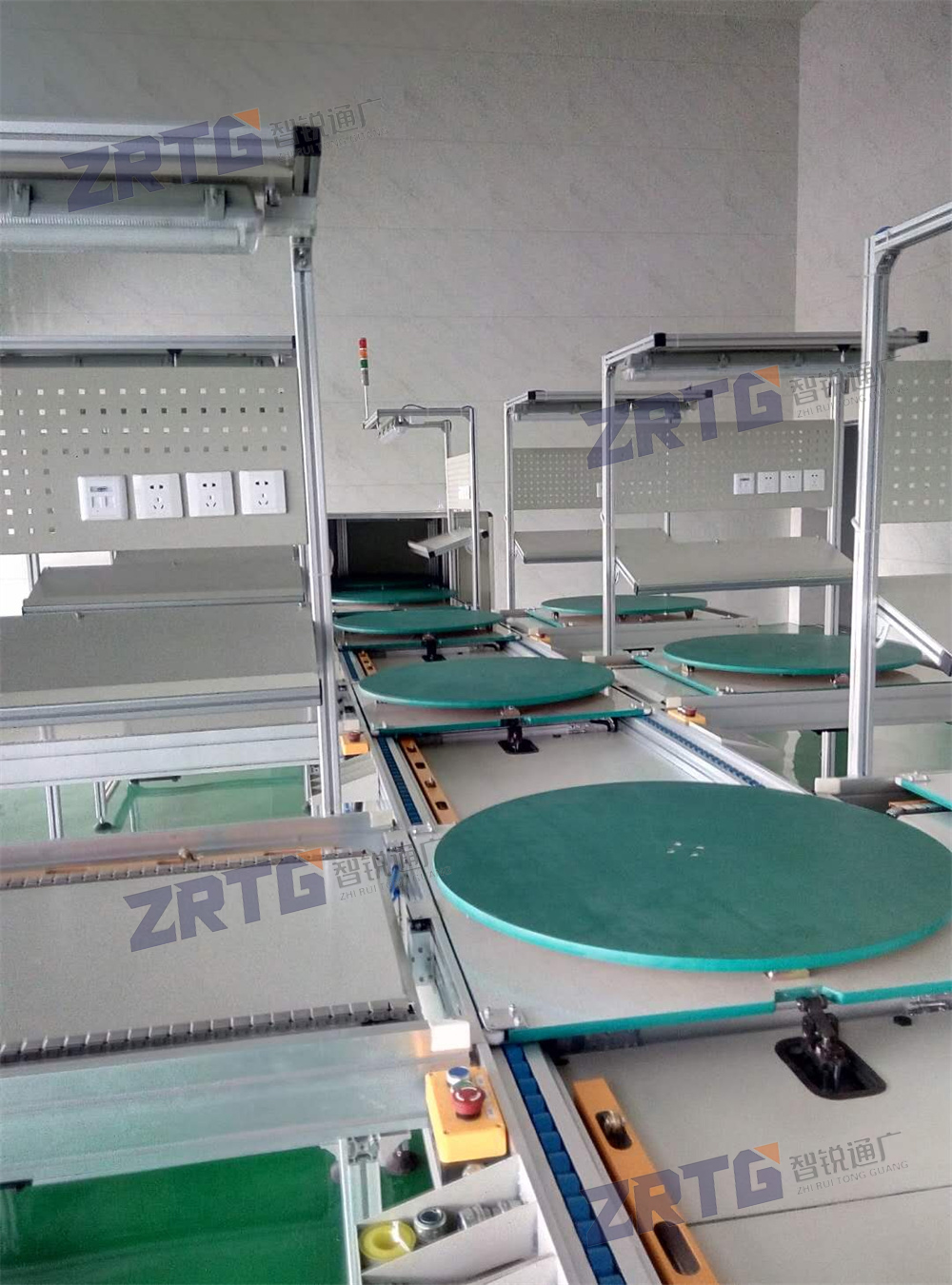 倍速链流水线由动力系统、控制系统、输送链条、工装板、阻断器、灯架照明、风扇、铝型材框架组成,另行配备了工作台、电源插座、气路辅助设施。